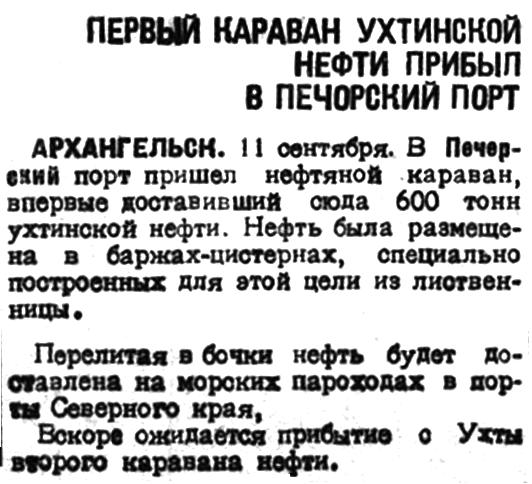 АРХАНГЕЛЬСК. 11 сентября. В Пвчорский порт пришел нефтяной караван, впервые доставивший сюда 600 тонн ухтинской нефти. Нефть была размещена в баржах-цистернах, специально построенных для этой цели из лиственницы.