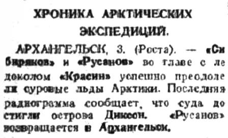 АРХАНГЕЛЬСК, 3. (Роста). - "Сибиряков" и "Русанов" во главе с ледоколом "Красин" успешно преодолели суровые льды Арктики. Последняя радиограмма сообщает, что суда достигли острова Диксон. "Русанов" возвращается в Архангельск.