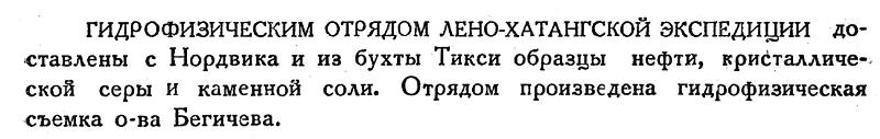 ГИДРОФИЗИЧЕСКИМ ОТРЯДОМ ЛЕНО-ХАТАНГСКОЙ ЭКСПЕДИЦИИ доставлены с Нордвика и из бухты Тикси образцы нефти, кристаллической серы и каменной соли. Отрядом произведена гидрофизическая съемка о-ва Бегичева.