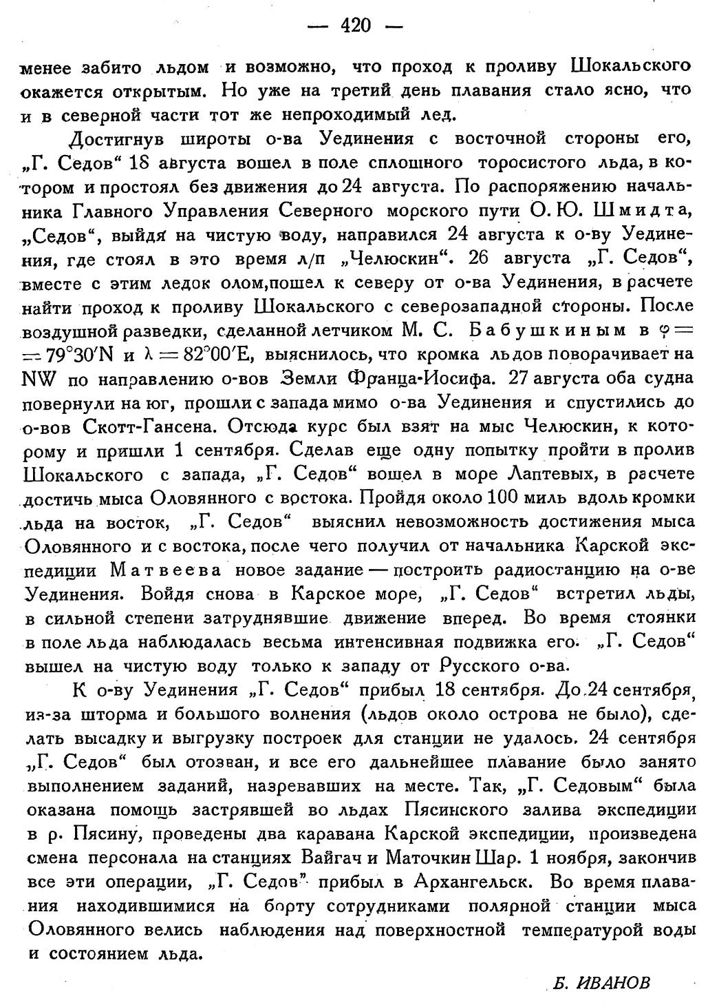 Достигнув широты о-ва Уединения с восточной стороны его, „Г. Седов" 18 августа вошел в поле сплошного торосистого льда, в котором и простоял без движения до 24 августа. По распоряжению начальника Главного Управления Северного морского пути О. Ю. Шмидта, „Седов", выйдя на чистую воду, направился 24 августа к о-ву Уединения, где стоял в это время л/п „Челюскин". 26 августа „Г. Седов", вместе с этим ледоколом, пошел к северу от о-ва Уединения, в расчете найти проход к проливу Шокальского с северозападной стороны. После воздушной разведки, сделанной летчиком М. С. Бабушкиным в φ = 79°30'N и λ = 82°00'Е, выяснилось, что кромка льдов поворачивает на NW по направлению о-вов Земли Франца-Иосифа. 27 августа оба судна повернули на юг, прошли с запада мимо о-ва Уединения и спустились до о-вов Скотт-Гансена. Отсюда курс был взят на мыс Челюскин, к которому и пришли 1 сентября. Сделав еще одну попытку пройти в пролив Шокальского с запада, „Г. Седов" вошел в море Лаптевых, в расчете достичь мыса Оловянного с востока. Пройдя около 100 миль вдоль кромки льда на восток, „Г. Седов" выяснил невозможность достижения мыса Оловянного и с востока, после чего получил от начальника Карской экспедиции Матвеева новое задание — построить радиостанцию на о-ве Уединения. Войдя снова в Карское море, „Г. Седов" встретил льды, в сильной степени затруднявшие движение вперед. Во время стоянки в поле льда наблюдалась весьма интенсивная подвижка его. „Г. Седов" вышел на чистую воду только к западу от Русского о-ва.