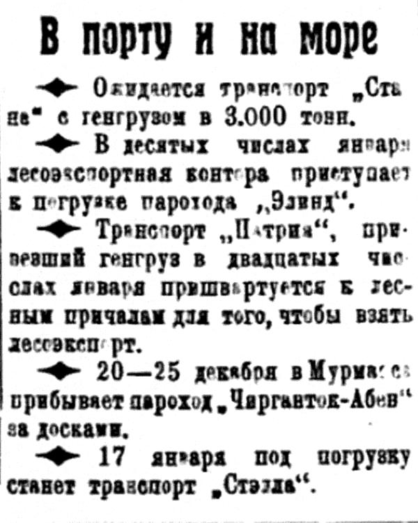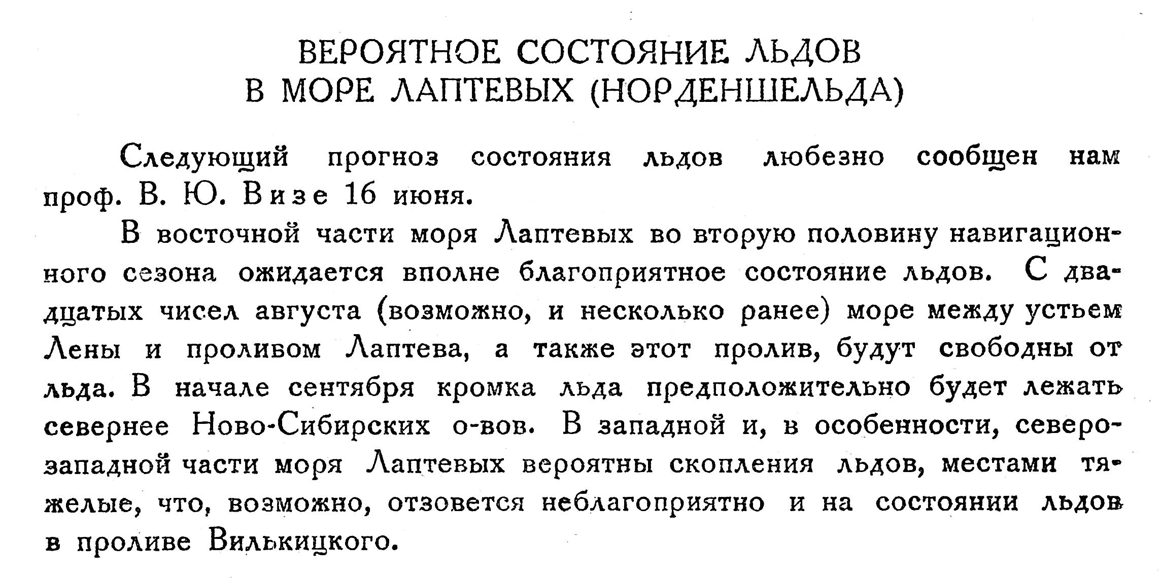 Из береговых работ проводится научное исследование в области Лены. Основная задача этого года совершить северо-восточный переход Архангельск — Владивосток. Этот переход уже делался три раза. Еще в 1863—6 году этот путь прошел Норденшельд, в 1912—15 годах ледоколы «Таймыр» и «Вайгач», совершившие путь в обратном направлении — Владивосток — Архангельск и, наконец, третий поход был сделав Амундсеном.