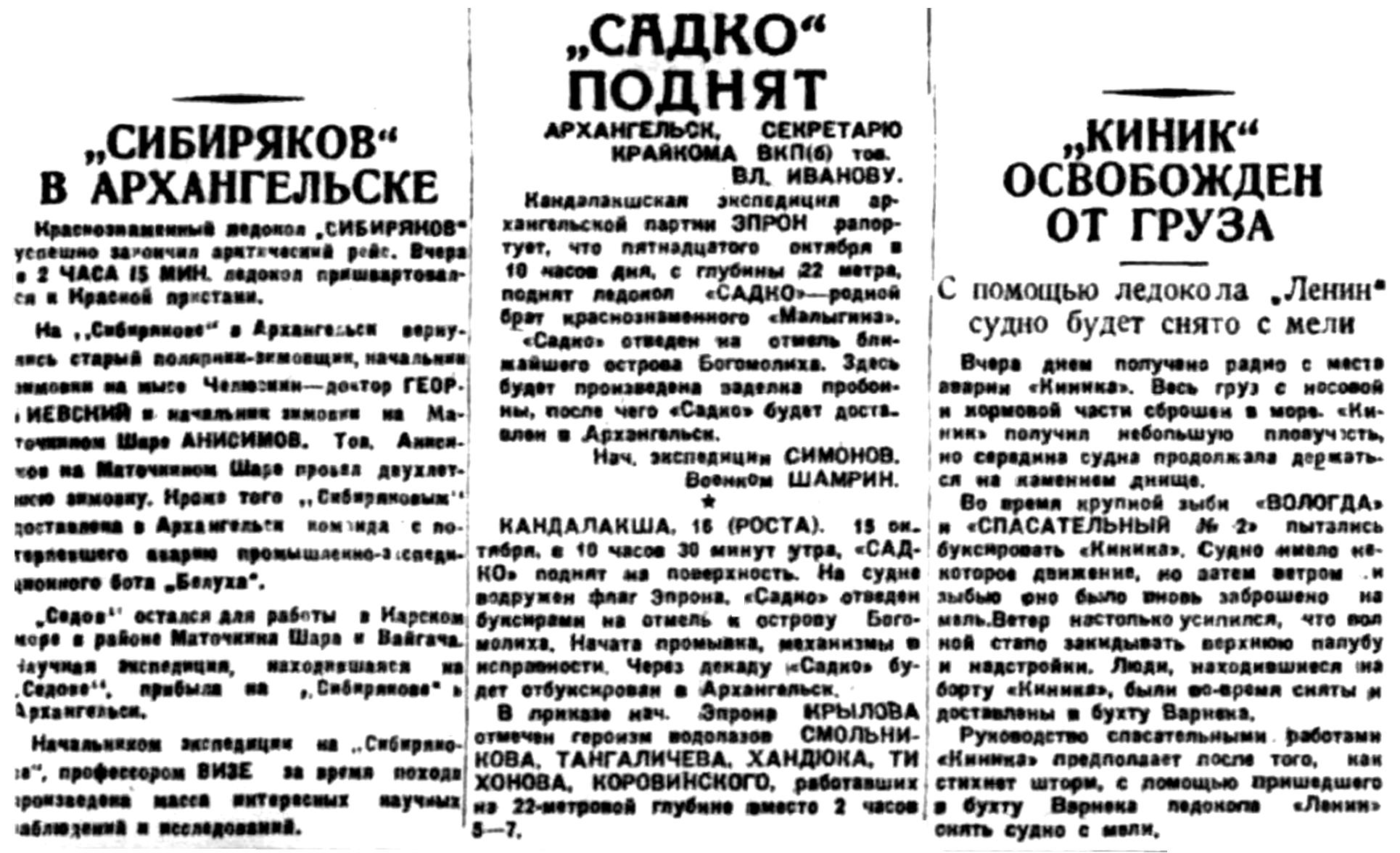 Кандалакшская экспедиция архангельской партии ЭПРОН рапортует, что пятнадцатого октября в 10 часов дня, с глубины 22 метра, поднят ледокол "САДКО" - родной брат краснознаменного "Малыгина".