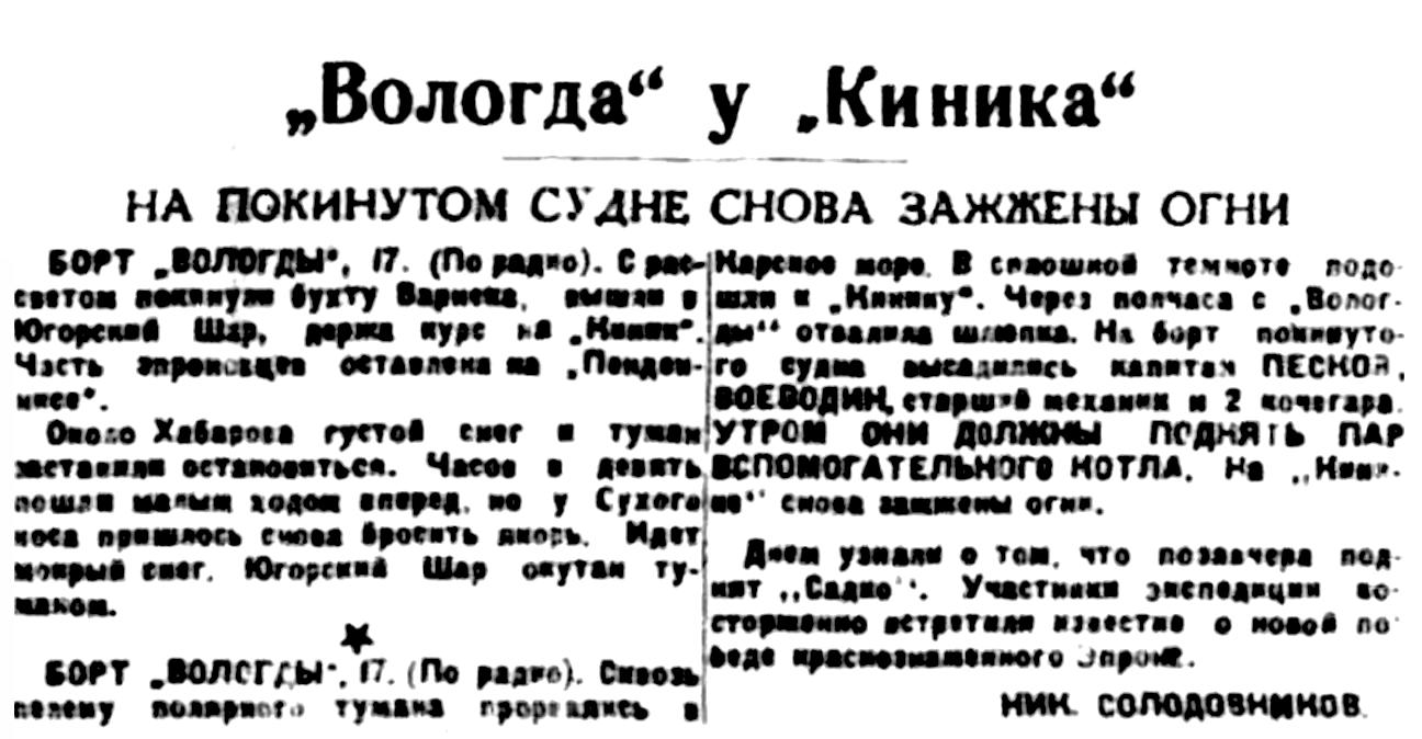 БОРТ "ВОЛОГДЫ", 6 (по радио наш спец. корр.). В условиях первой полярной пурги начинается соревнование участников экспедиции по спасению "Киника". Архангельский отряд краснознаменного ЭПРОН'а объявил себя ударным и вызвал на соревнование команды "Вологды" и "Спасательного-2".