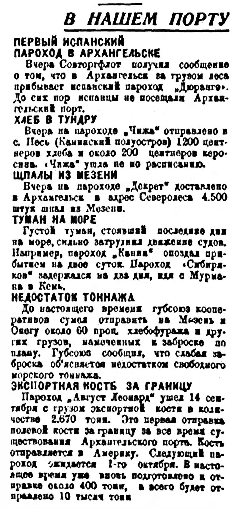 Пароход "Август Леонард" ушел 14 сентября с грузом экспортной кости в количестве 2.670 тонн. Это первая отправка полевой кости заграницу за все время существования Архангельского порта. Кость отправляется в Америку. Следующий пароход ожидается 1-го октября. В настоящее время уже вновь подготовлено к отправке около 400 тонн, а всего будет отправлено 10 тысяч тонн.