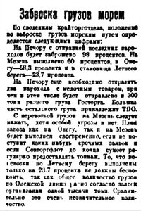 До настоящего времени губсоюз кооперативов сумел отправить на Мезень и Онегу около 60 проц. хлебофуража и других грузов, намеченных к заброске по плану. Губсоюз сообщал, что слабая заброска объясняется недостатком свободного морского тоннажа.