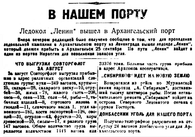 Вчера вечером редакцией было получено сообщение о том, что для проведения ледокольной кампании в Архангельском порту из Ленинграда вышел ледокол "Ленин", который должен прибыть в Архангельск 25 сентября. По пути "Ленин" зайдет в один из портов Норвегии для пополнения запасов угля.