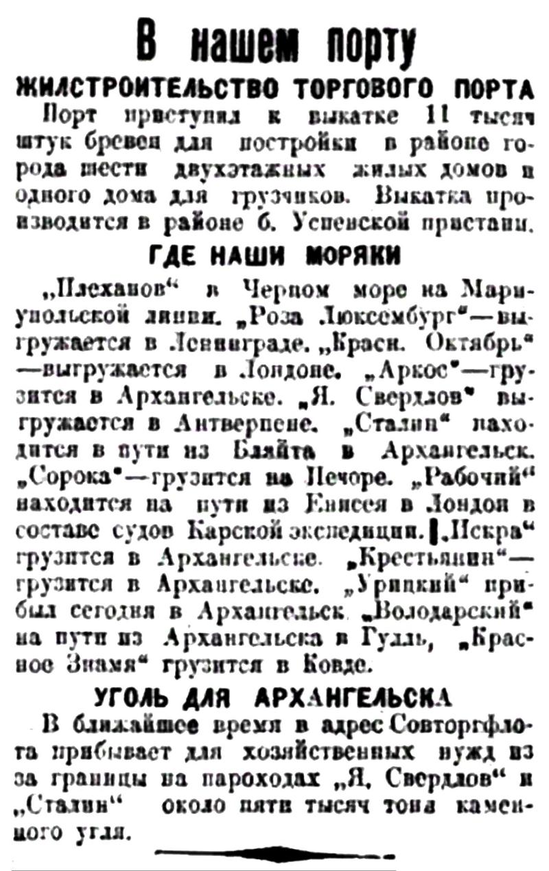 "Плеханов" в Черном море на Мариупольской линии. "Роза Люксембург" — выгружается в Ленинграде. "Красн. Октябрь" — выгружается в Лондоне. "Аркос" — грузится в Архангельске. "Я. Свердлов" выгружается в Антверпене. "Сталин" находятся в пути из Бляйта в Архангельск. "Сорока" — грузится на Печоре. "Рабочий" находится на пути из Енисея в Лондон в составе судов Карской экспедиции. "Искра" грузится в Архангельске. "Крестьянин" — грузится в Архангельске. "Урицкий" прибыл сегодня в Архангельск. "Володарский" на пути из Архангельска в Гулль. "Красное Знамя" грузится в Ковде.