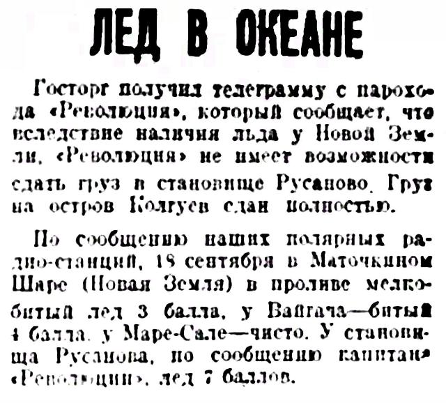 Госторг получил телеграмму с парохода "Революция", который сообщает, что вследствие наличия льда у Новой Земли, "Революция" не имеет возможности сдать, груз в становище Русаново. Груз на остров Колгуев сдан полностью.
