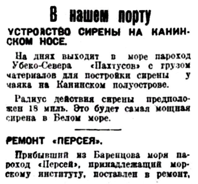 На днях выходит в море пароход Убеко-Севера "Пахтусов" с грузом материалов для постройки сирены у маяка на Канинском полуострове.