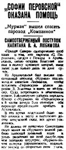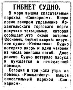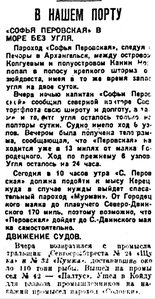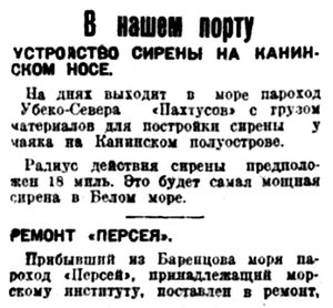 Вчера на пароходе "Чижа" отправлено в с. Несь (Канинский полуостров) 1200 центнеров хлеба и около 200 центнеров керосина. "Чижа" ушла не по расписанию.