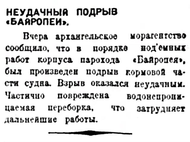 Вчера архангельское морагентство сообщило, что в порядке подъемных работ корпуса парохода "Байропея", был произведен подрыв кормовой части судна. Взрыв оказался неудачным. Частично повреждена водонепроницаемая переборка, что затрудняет дальнейшие работы.
