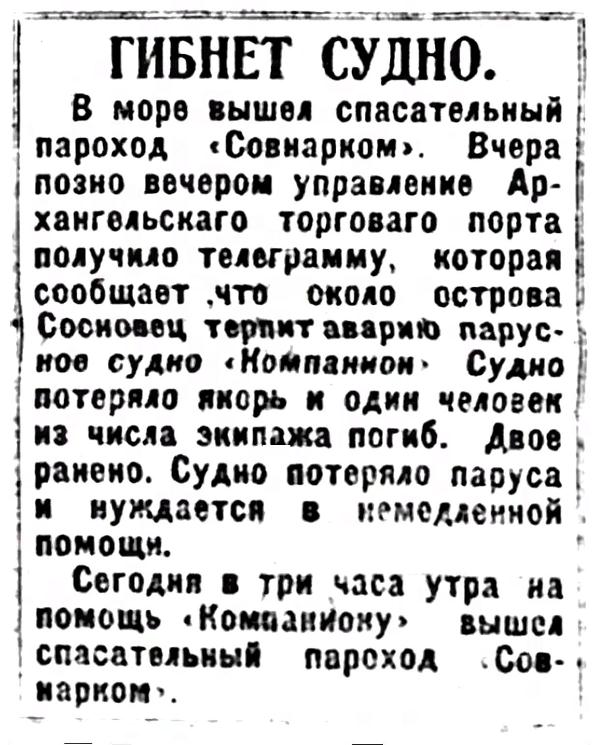 В море вышел спасательный пароход "Совнарком". Вчера поздно вечером управление Архангельского торгового порта получило телеграмму, которая сообщает, что около острова Сосновец терпит аварию парусное судно "Компанион". Судно потеряло якорь и один человек из числа экипажа погиб. Двое ранено. Судно потеряло паруса и нуждается в немедленной помощи.