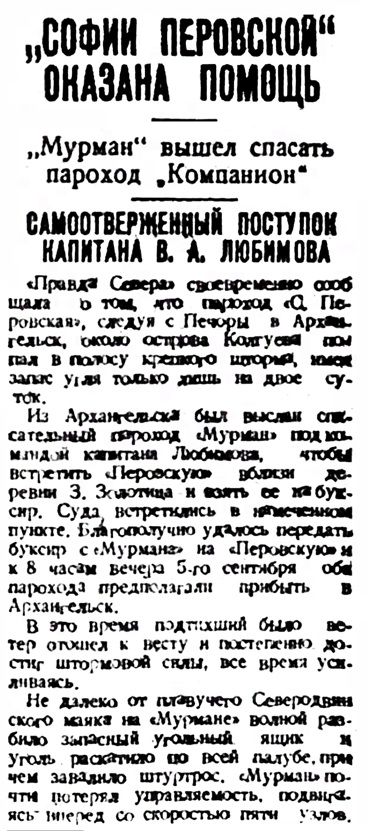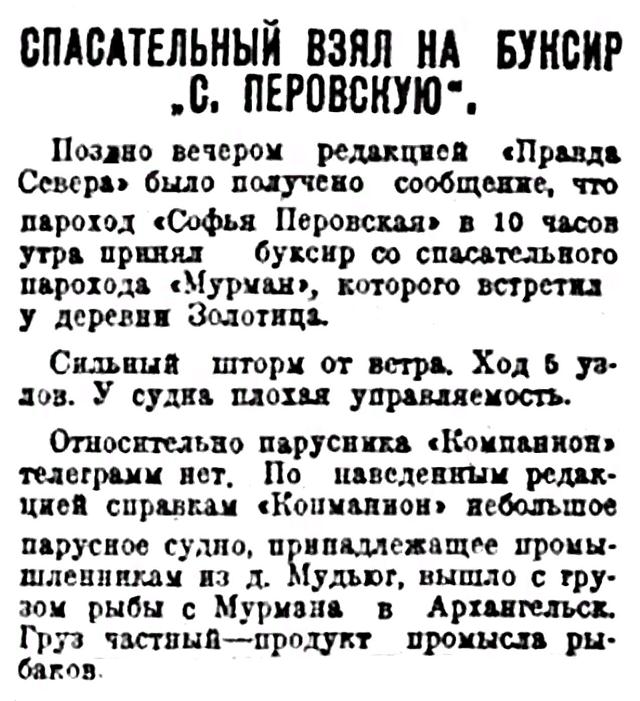 Поздно вечером редакцией "Правды Севера" было получено сообщение, что пароход "Софья Перовская" в 10 часов утра принял буксир со спасательного парохода "Мурман", которого встретил у деревня Золотица.