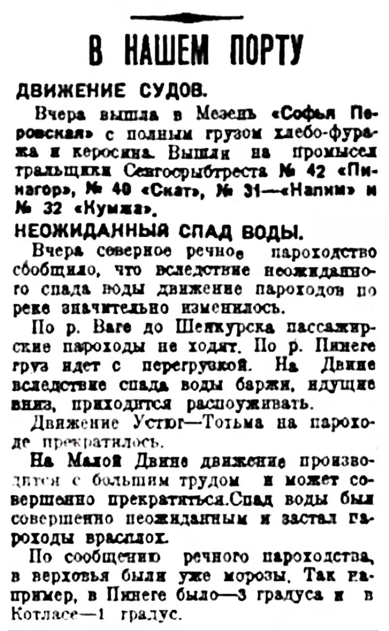 Вчера вышла в Мезень "Софья Перовская" с полным грузом хлебофуража и керосина. Вышли на промысел тральщики Севгосрыбтреста № 42 «Пинагор», № 40 "Скат", № 31 - "Налим" и № 32 "Кумжа".