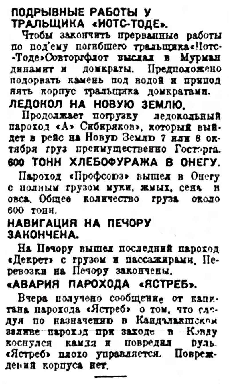 Вчера ушел срочным рейсом по Онежской линии пароход "Соловки". 30 сентября по Онежской линии отправляется последний срочный пароход. Последним срочным рейсом по Мурманской линии выйдет пароход 28 сентября. По линии Кемь — Онега срочные рейсы кончаются 30 сентября. Сверхсрочным ушел вчера по Кандалакшской линии "Азимут" и в Мезень — "Декрет".