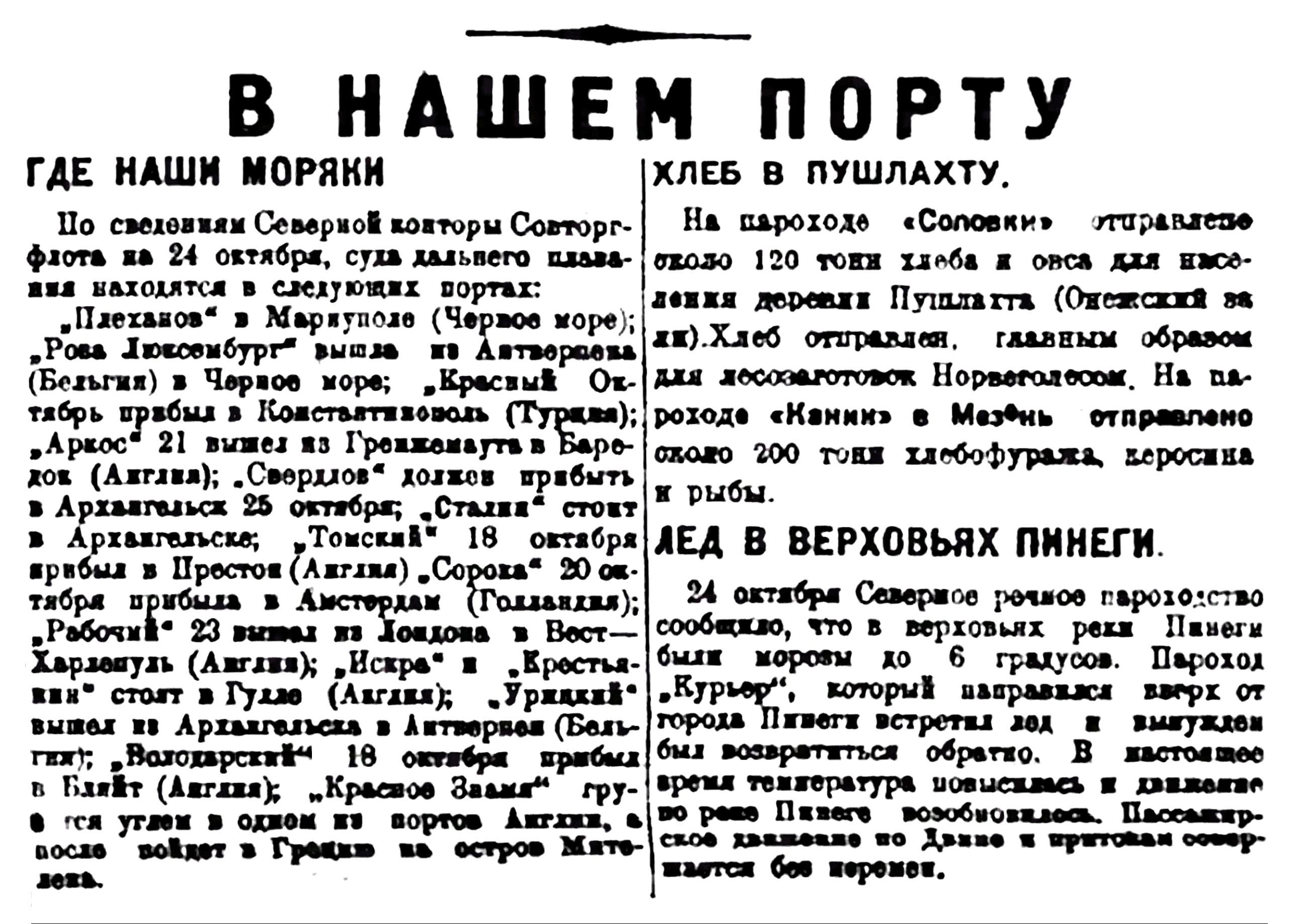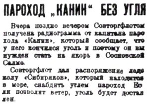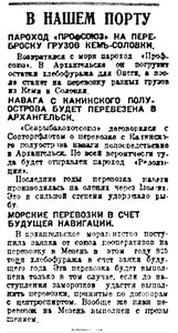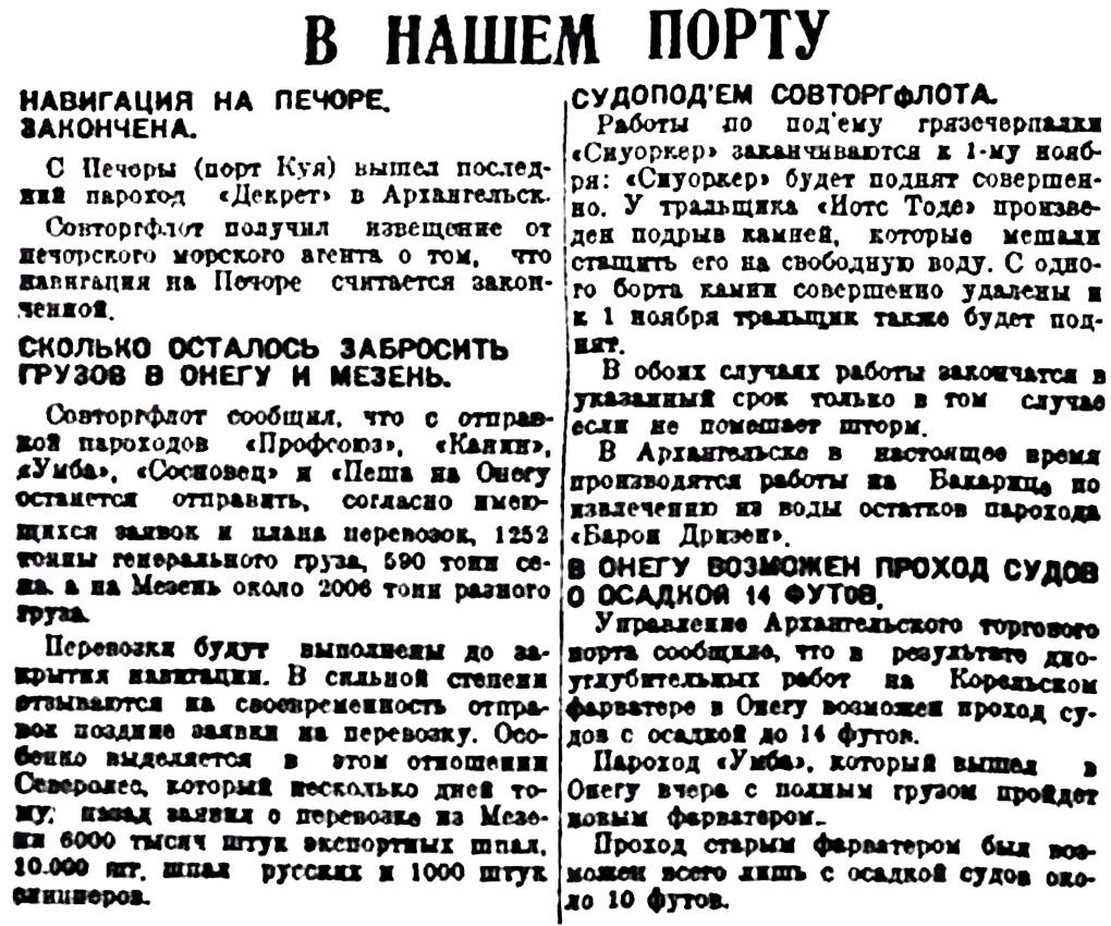 Вышел в Мезень несрочным рейсом пароход "Сосновец" и на рыбный промысел тральщики Севгосрыбтреста № 24 "Щука" и № 28 "Камбала". Барк "Альбатрос" кончает погрузку.