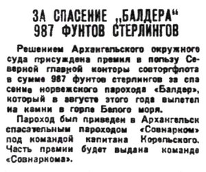 Северная главная контора Совторгфлота получила извещение из Мурманска о том, что после целого ряда усилий "Сиуоркера" удалось поднять на 13 фут и подвинуть к берегу на расстояние 14 метров. Осталось поднять еще на 4 фута и подвинуться к берегу на 8-10 метров, после чего работы будут производиться уже над водой.