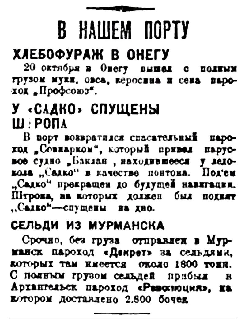 Учебное судно "Ломоносов" идет в Онегу с грузом сена и овса для лесозаводов Норвеголеса в Онеге. "Ломоносов", как и "Альбатрос", выгружаться будут на Онежском баре. Посылка таких крупных судов в Онегу объясняется во-первых скопленном грузов, а во-вторых не имением достаточного количества тоннажа.
