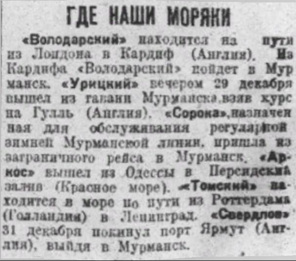 «Володарский» находится на пути из Лондона в Кардиф (Англия). Из Кардифа «Володарский» пойдет в Мурманск. «Урицкий» вечером 29 декабря вышел из гавани Мурманска, взяв курс из Гулль (Англия). «Сорока», назначенная для обслуживания регулярной зимней Мурманской линии, пришла из заграничного рейса в Мурманск. «Аркос» вышел из Одессы в Персидский залив (Красное море). «Томский» находится в море на пути из Роттердама (Голландия) в Ленинград. «Свердлов» 31 декабря покинул порт Ярмут (Англия), выйдя в Мурманск.