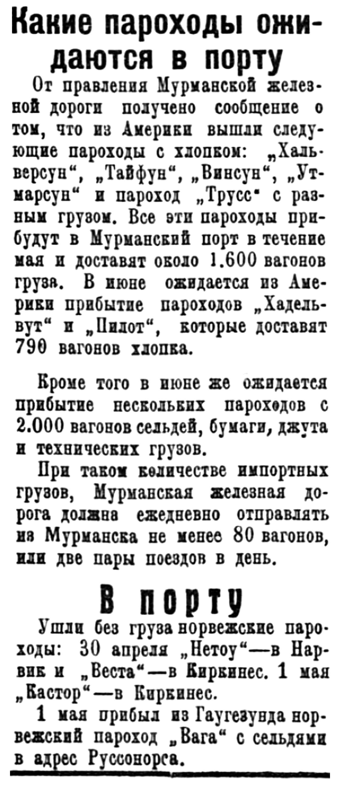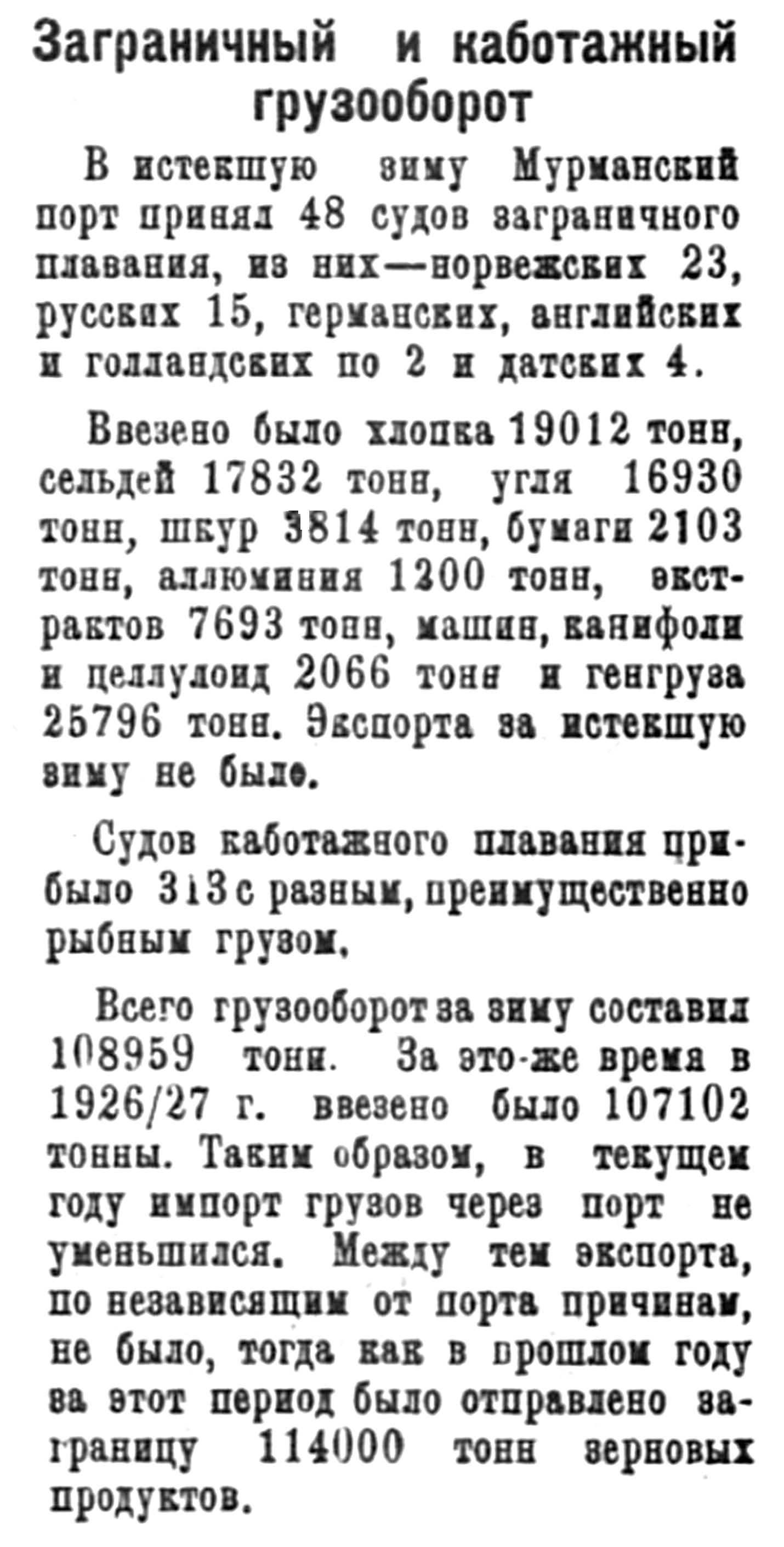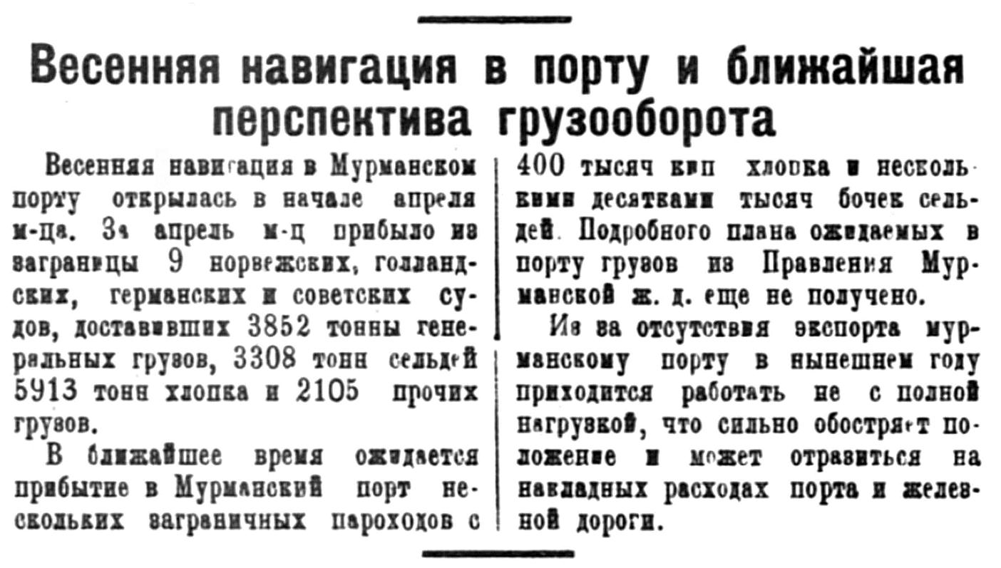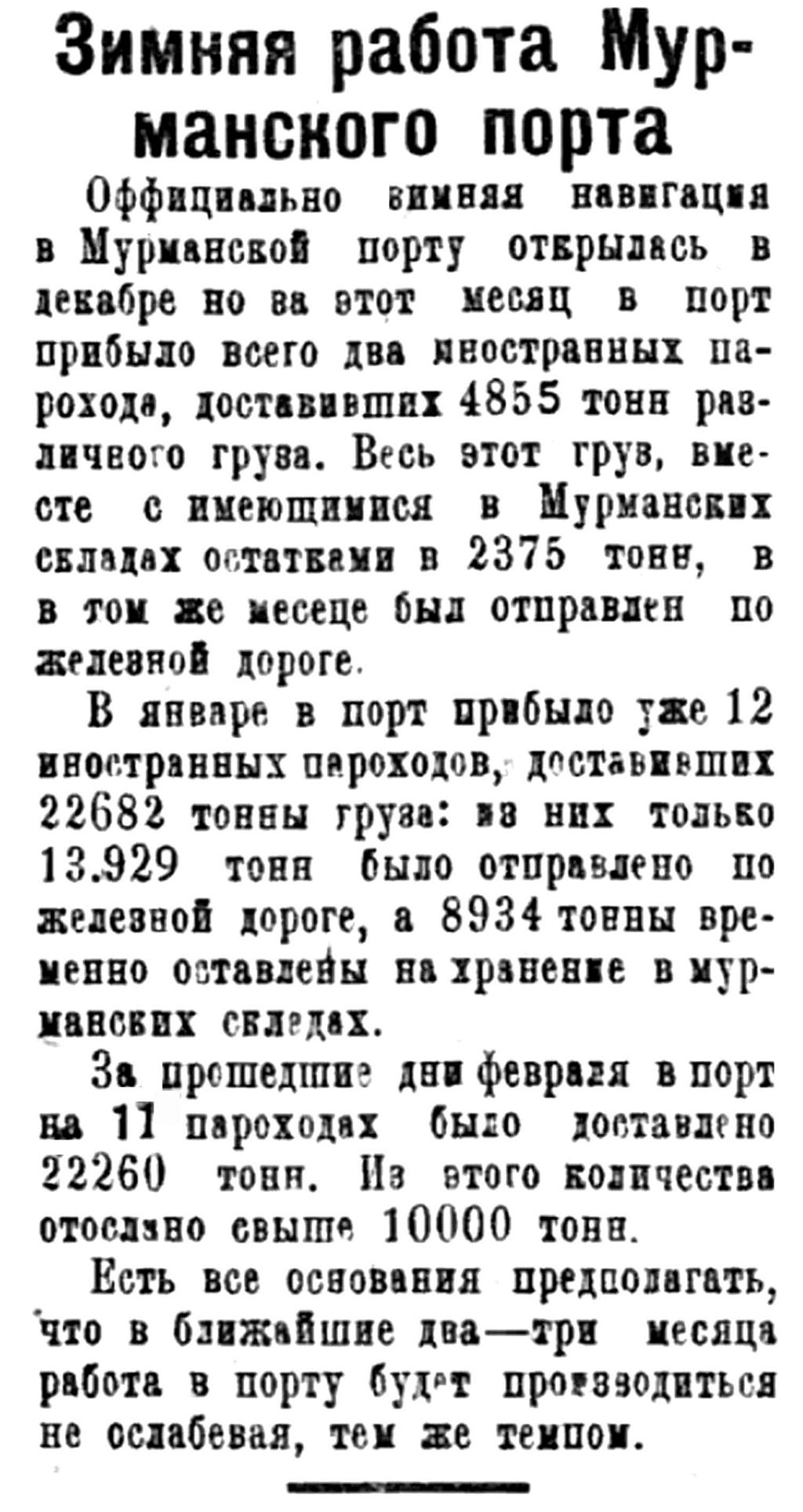 Официально зимняя навигация в Мурманской порту открылась в декабре но за этот месяц в порт прибыло всего два иностранных парохода, доставивших 4855 тонн различного груза. Весь этот груз, вместе с имеющимися в Мурманских складах остатками в 2375 тонн, в том же месяце был отправлен по железной дороге.