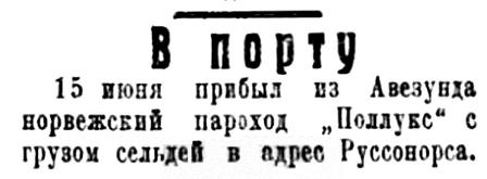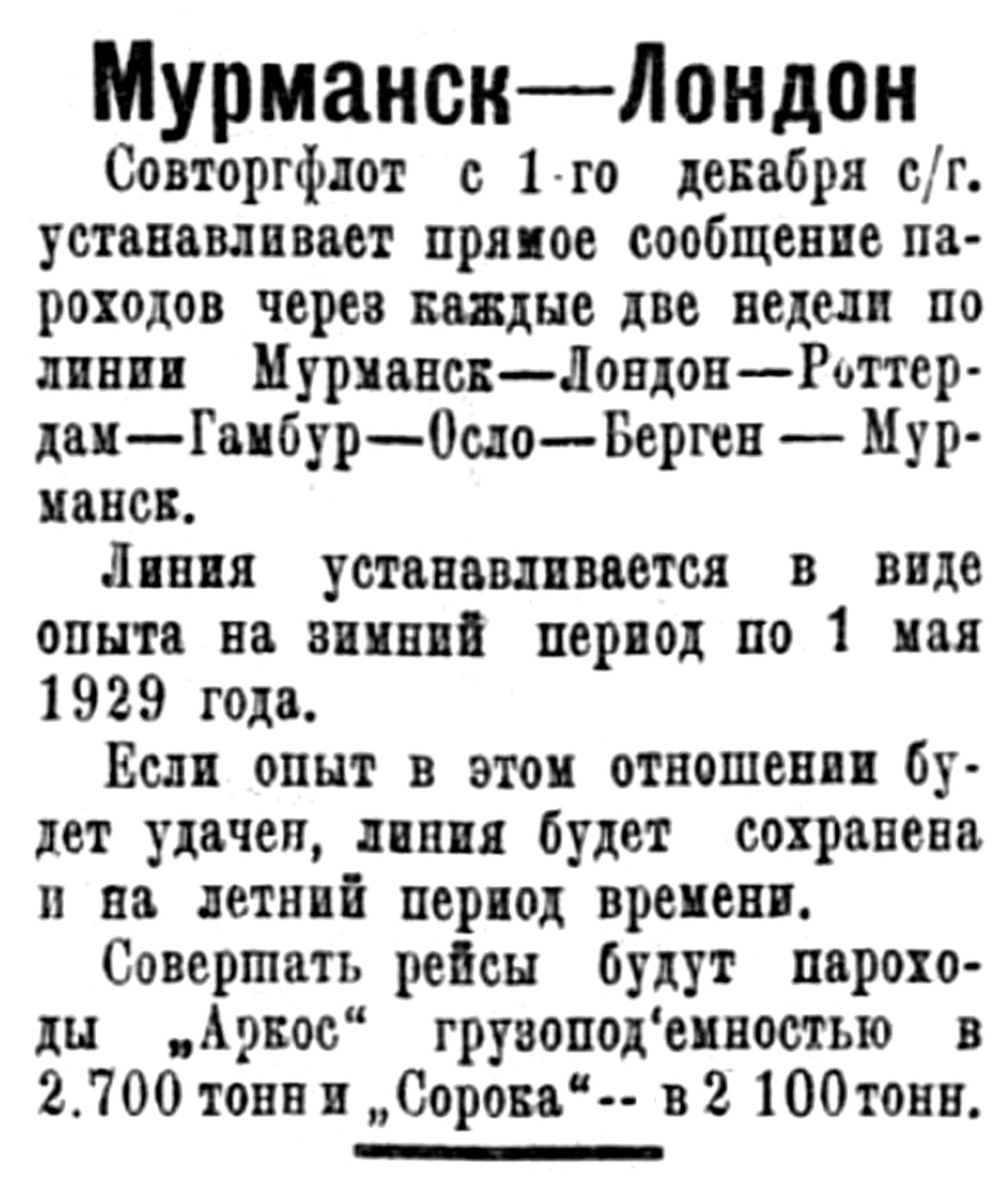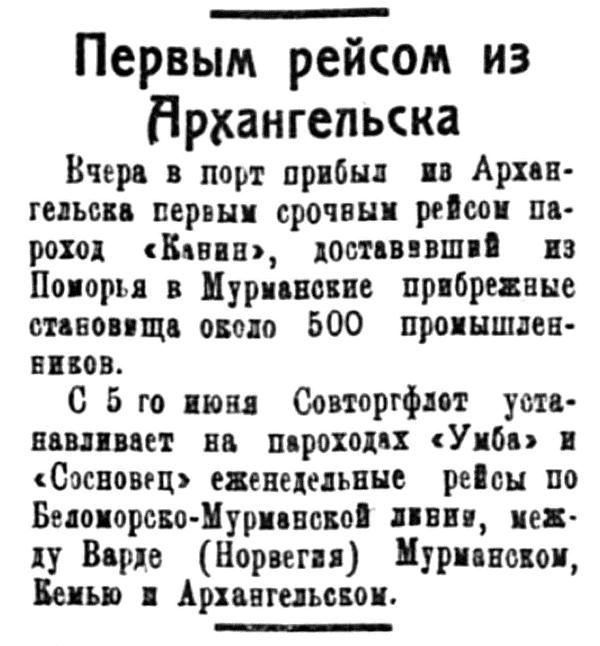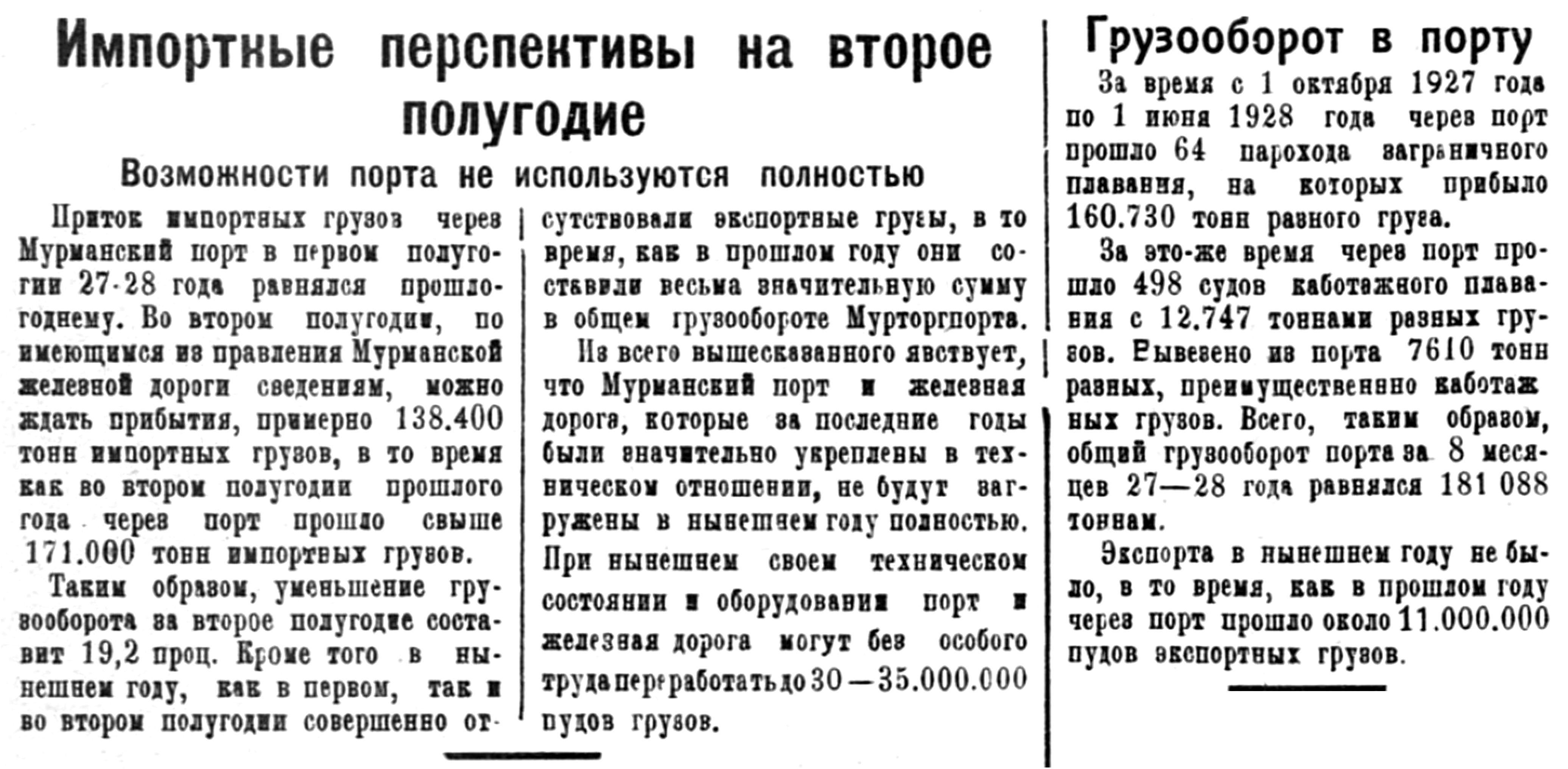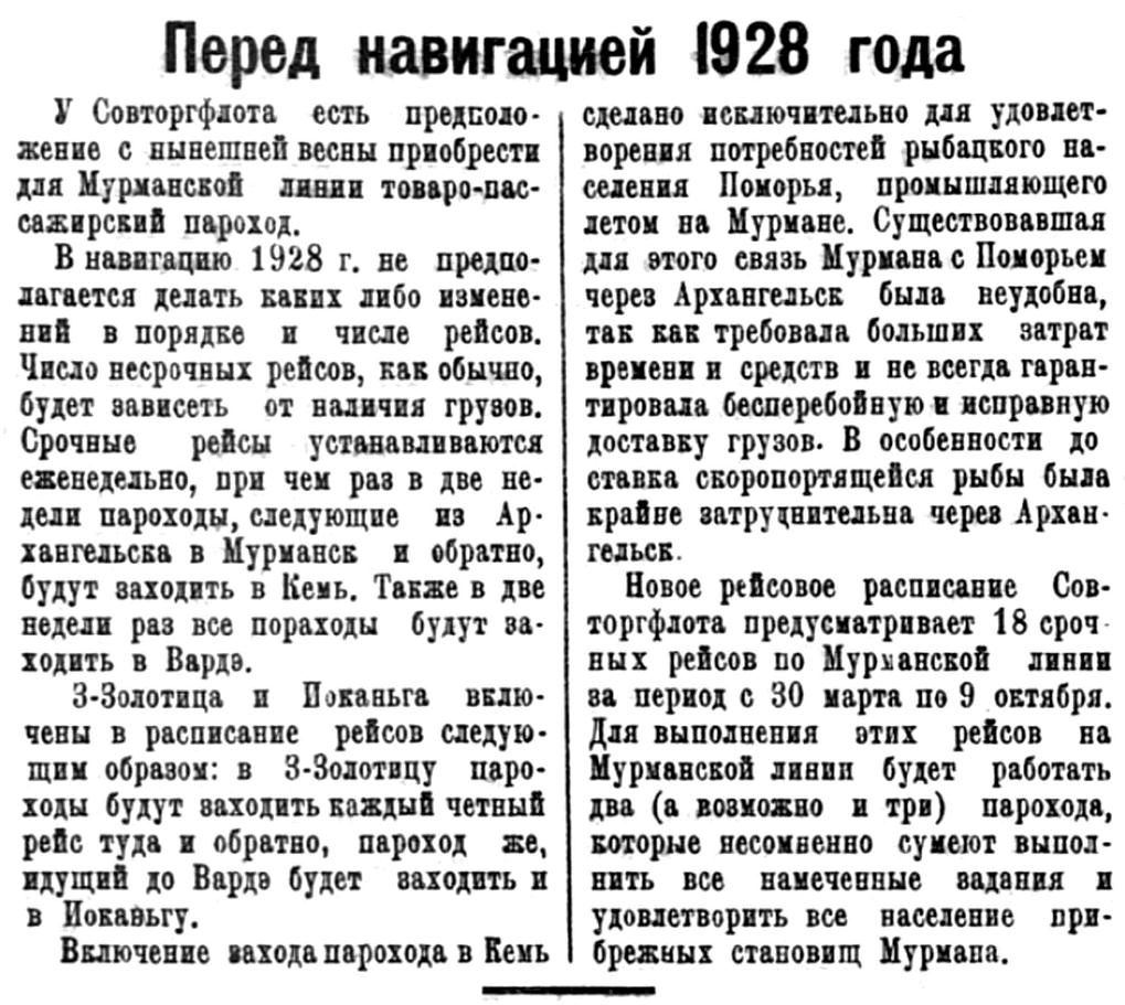 Официально зимняя навигация в Мурманской порту открылась в декабре но за этот месяц в порт прибыло всего два иностранных парохода, доставивших 4855 тонн различного груза. Весь этот груз, вместе с имеющимися в Мурманских складах остатками в 2375 тонн, в том же месяце был отправлен по железной дороге.
