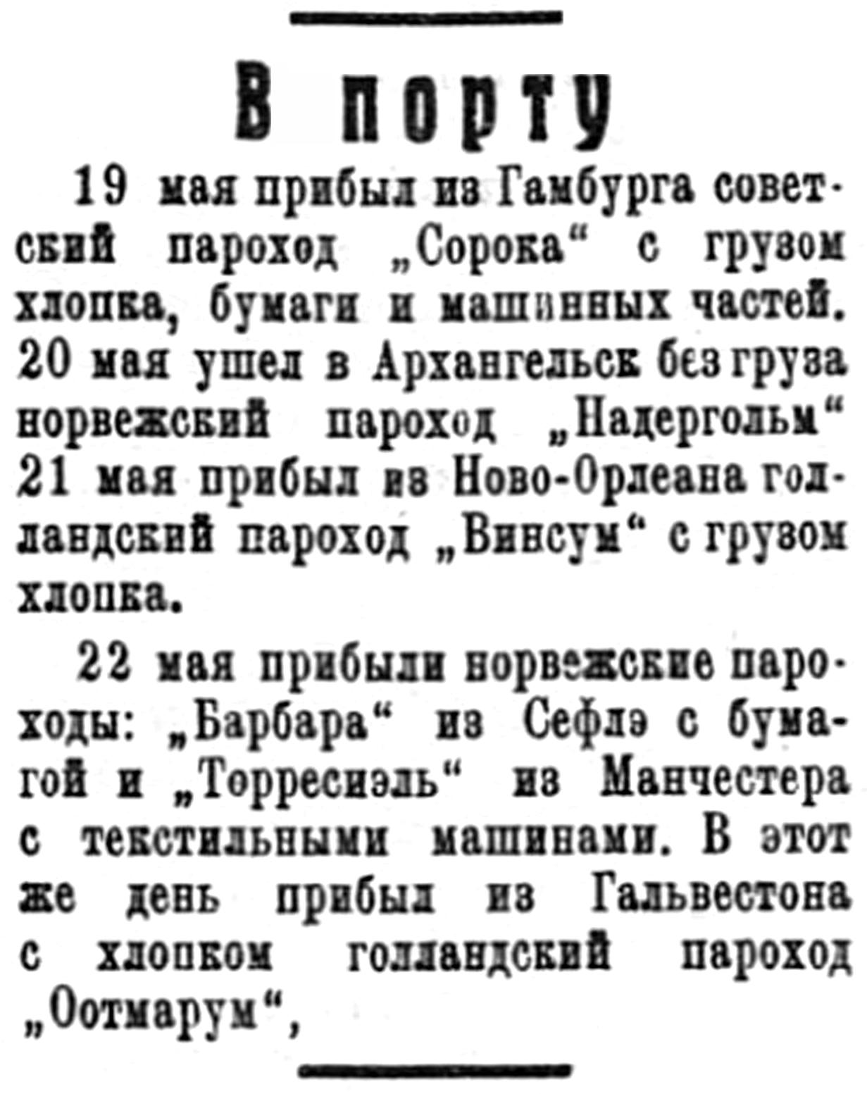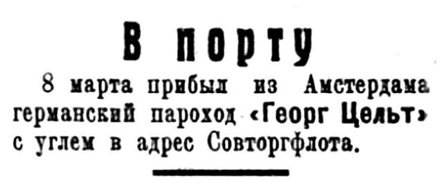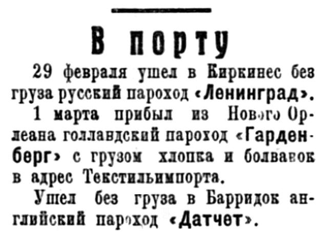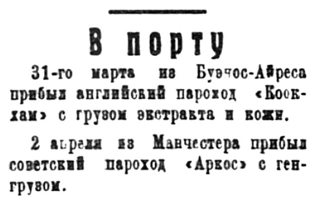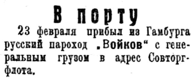 23 февраля прибыл из Гамбурга русский пароход "Войков" с генеральным грузом в адрес Совторгфлота.