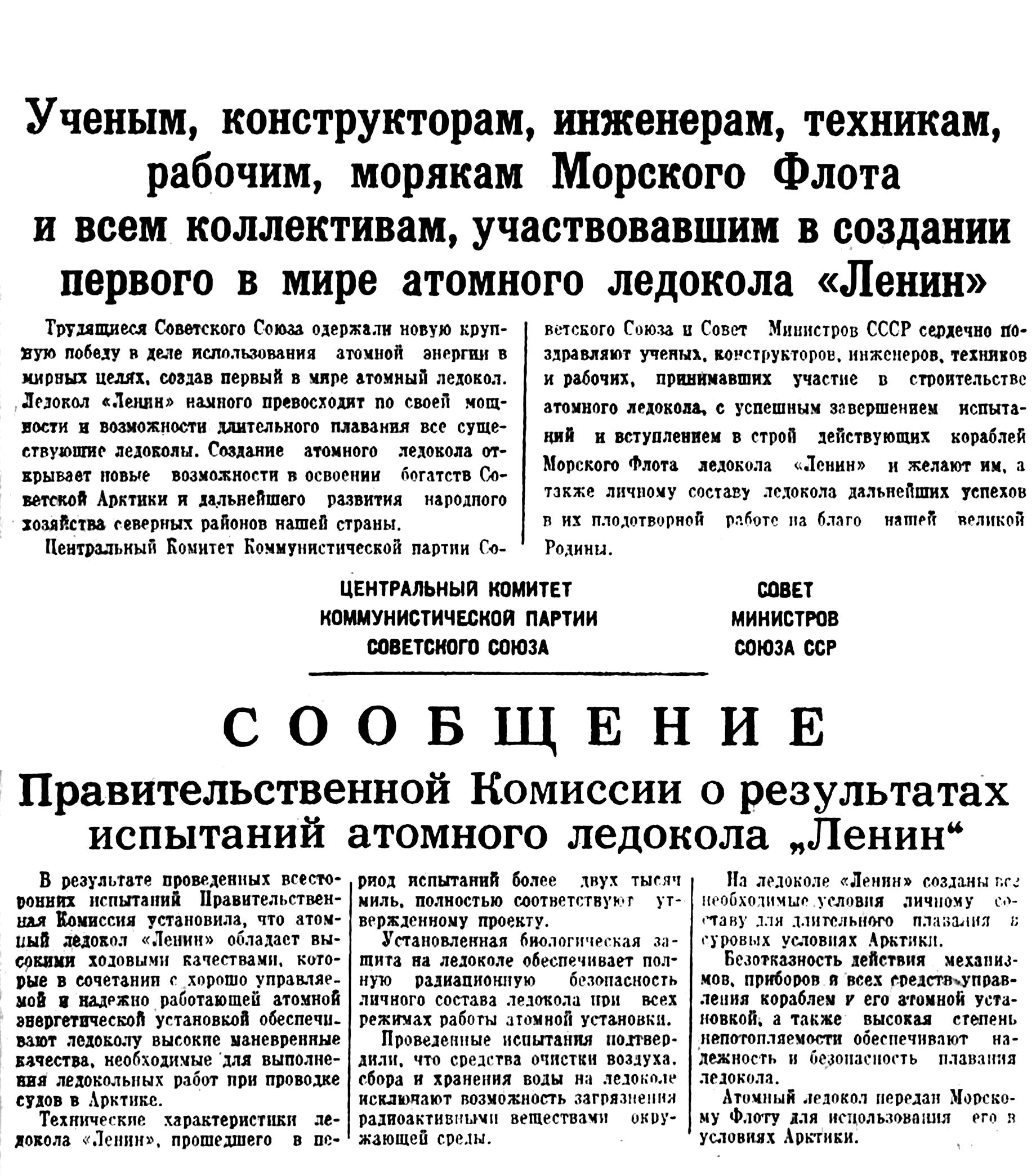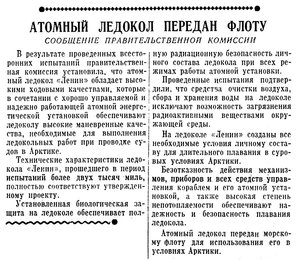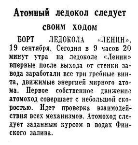 ЛЕНИНГРАД, 1 сентября. (ТАСС). Немного времени осталось до выхода на ходовые испытания атомного ледокола «Ленин», построенного ленинградскими судостроителями. Пока этот арктический богатырь стоит на том же месте у причальной стенки Адмиралтейского завода.