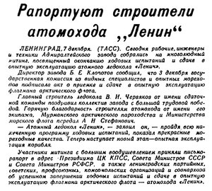 — Сейчас наша главная забота — все подготовить к выходу в море, успешно провести ходовые испытания по намеченной программе и сдать корабль в установленный срок, — говорит старший мастер монтажного цеха инженер А. А. Тарасенко, которого мы встретили в одном из внутренних помещений корабля. Стоящие на вахте у машин заводские мастера, бригадиры и слесари-монтажники тщательно проверяют действие каждого механизма и одновременно знакомят со сложной новой техникой машинистов и других членов экипажа, которые поведут атомоход в арктическое плавание.