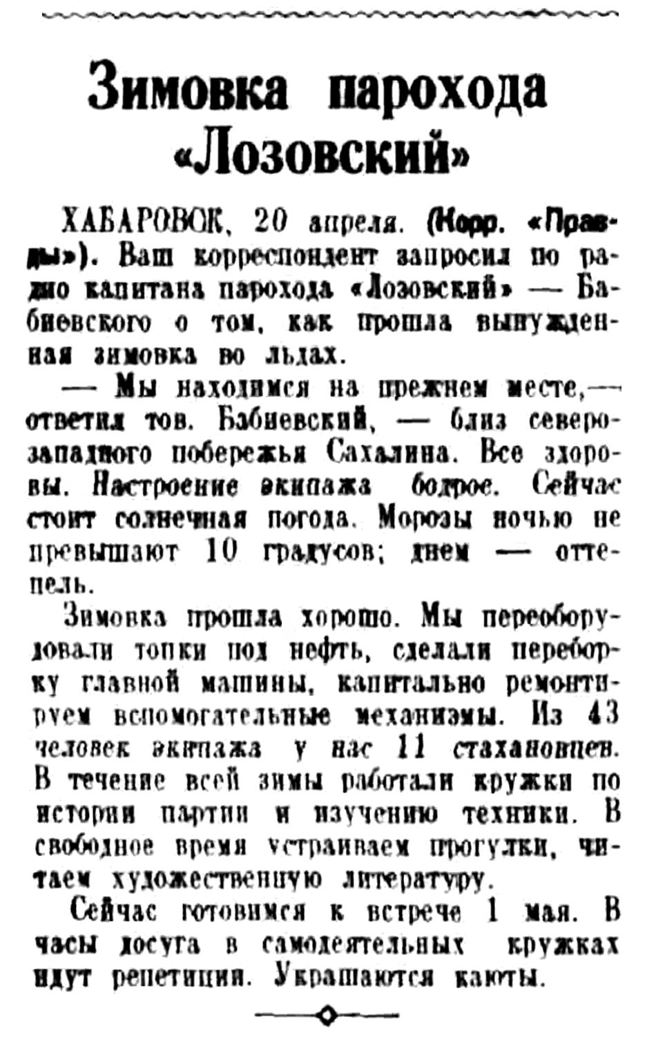 ХАБАРОВСК, 20 апреля. (Корр. "Правды"). Ваш корреспондент запросил по радио капитана парохода "Лозовский" — Бабиевского о том, как прошла вынужден­ная зимовка во льдах.