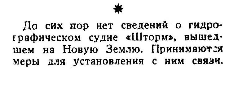 До сих пор нет сведений о гидрографическом судне «Шторм», вышедшем на Новую Землю. Принимаются меры для установления с ним связи.