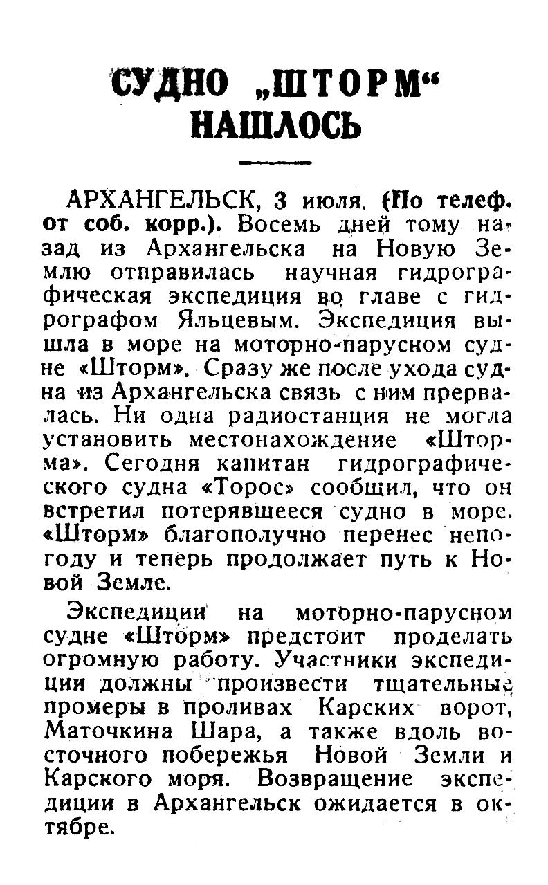 АРХАНГЕЛЬСК, 3 июля. (По телеф. от соб. корр.). Восемь дней тому назад из Архангельска на Новую Землю отправилась научная гидрографическая экспедиция во главе с гидрографом Яльцевым. Экспедиция вышла в море на моторно-парусном судне «Шторм». Сразу же после ухода судна из Архангельска связь с ним прервалась. Ни одна радиостанция не могла установить местонахождение «Шторма». Сегодня капитан гидрографического судна «Торос» сообщил, что он встретил потерявшееся судно в море. «Шторм» благополучно перенес непогоду и теперь продолжает путь к Новой Земле.