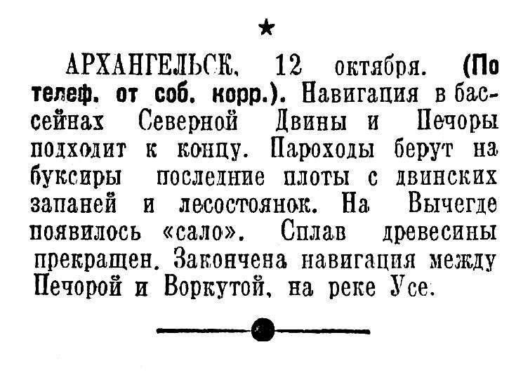 АРХАНГЕЛЬСК, 12 октября. (По телеф. от соб. корр.). Навигация в бассейнах Северной Двины и Печоры подходит к концу. Пароходы берут на буксиры последние плоты с двинских запаней и лесостоянок. На Вычегде появилось «сало». Сплав древесины прекращен. Закончена навигация между Печорой и Воркутой, на реке Усе.