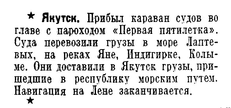 Якутск. Прибыл караван судов во главе с пароходом «Первая пятилетка». Суда перевозили грузы в море Лаптевых, на реках Яне, Индигирке, Колыме. Они доставили в Якутск грузы, пришедшие в республику морским путем. Навигация на Лене заканчивается.