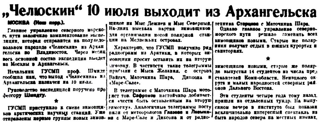 Начальник ГУСМП проф. Шмидт сообщил нам, что выход "Челюскина" из Архангельска назначен на 10 июля.