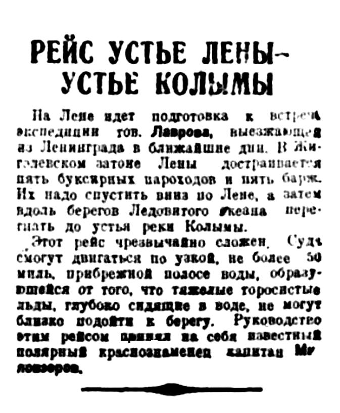 На Лене идет подготовка к встрече экспедиции тов. Лаврова, выезжающей из Ленинграда в ближайшие дни. К Жиголевском затоне Лены достраивается пять буксирных пароходов и пять барж. Их надо спустить вниз по Лене, а затем вдоль берегов Ледовитого океана перегнать до устья реки Колымы.