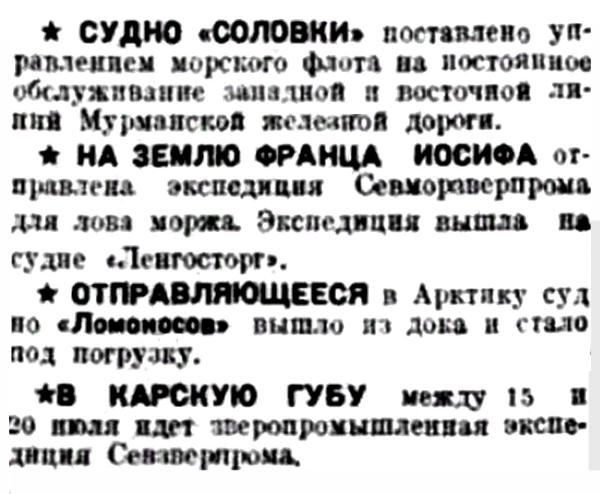 * 28 ИЮНЯ СО ШПИЦБЕРГЕНА вышел пароход "Сталин" с 3 тыс. тонн угля. Сегодня "Сталин" ожидается в Архангельске.