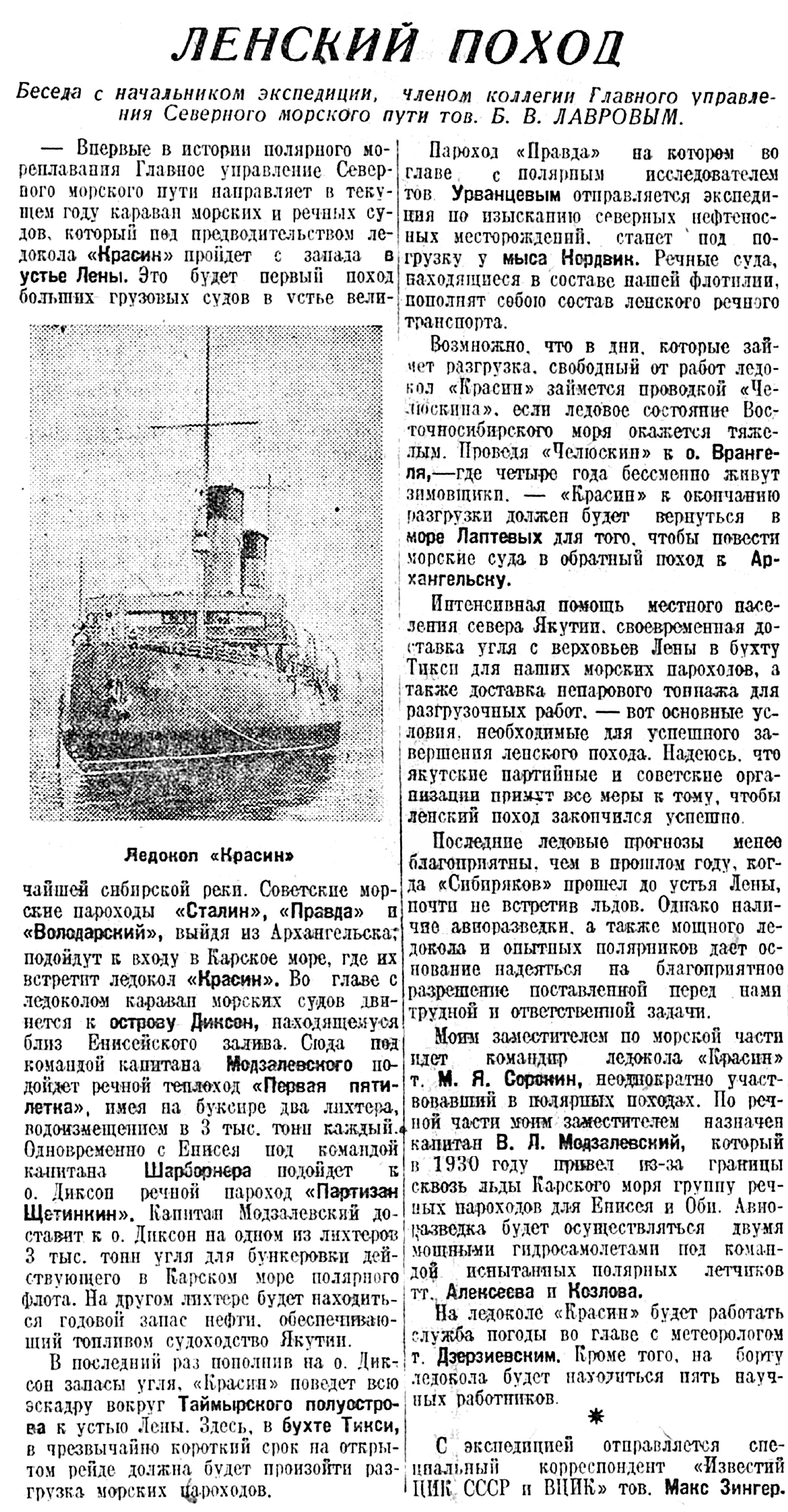 — Впервые в истории полярного мореплавания Главное управление Северного морского пути направляет в текущем году караван морских и речных судов, который под предводительством ледокола "Красин" пройдет с запада в устье Лены. Это будет первый поход больших грузовых судов в устье величайшей сибирской реки. Советские морские пароходы «Сталин", "Правда" и "Володарский", выйдя из Архангельска, подойдут к входу в Карское море, где их встретит ледокол "Красин". Во главе с ледоколом караван морских судов двинется к острову Диксон, находящемуся близ Енисейского залива. Сюда под командой капитана Модзалевского подойдет речной теплоход "Первая пятилетка", имея на буксире два лихтера, водоизмещением в 3 тыс. тонн каждый. Одновременно с Енисея под командой капитана Шарборнера подойдет к о. Диксон речной пароход "Партизан Щетинкин". Капитан Модзалевский доставит к о. Диксон на одном из лихтеров 3 тыс. тонн угля для бункеровки действующего в Карском море полярного флота. На другом лихтере будет находиться годовой запас нефти, обеспечивающий топливом судоходство Якутии.