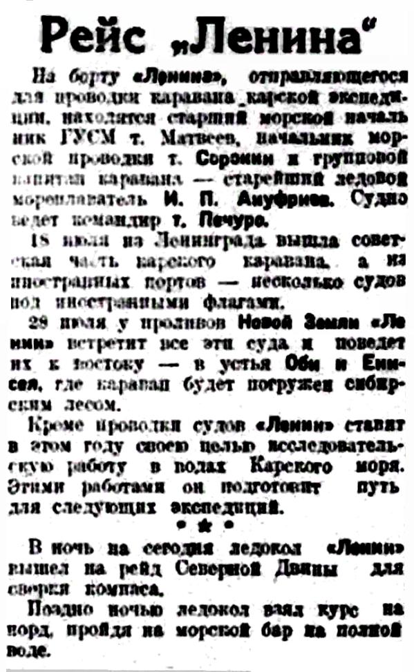 На борту "Ленина", отравляющегося для проводки каравана карской экспедиции, находятся старший морской начальник ГУСМП т. Матвеев, начальник морской проводки т.Сорокин и групповой капитан каравана — старейший ледовый мореплаватель И. П. Ануфриев. Судно ведет командир т. Печуро.