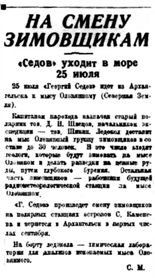 Капитаном парохода назначен старый полярник тов. Д. И. Швецов, начальником экспедиции — тов. Шикин. Ледокол доставит на мыс Оловянный группу зимовщиков в составе до 30 человек. В это число входят геологи, которые будут зимовать на мысе Оловянном и делать разведки на ценные руды, путем глубокого бурения. Остальная часть зимовщиков — работники будущей радиометеорологической станции на мысе Оловянном.