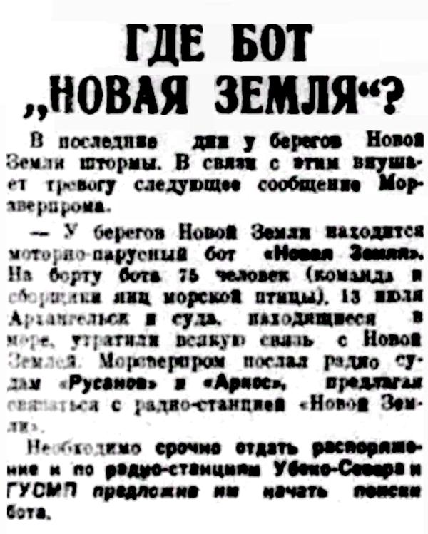 — У берегов Новой Земли находится моторно-парусный бот "Новая Земля". На борту бота 75 человек (команда и сборщики яиц морской птицы). 13 июля Архангельск и суда, находящиеся в море, утратили всякую связь с "Новой Землей". Морзверпром послал радио судам "Русанов" и "Аркос", предлагая связаться с радио-станцией "Новой Земли".