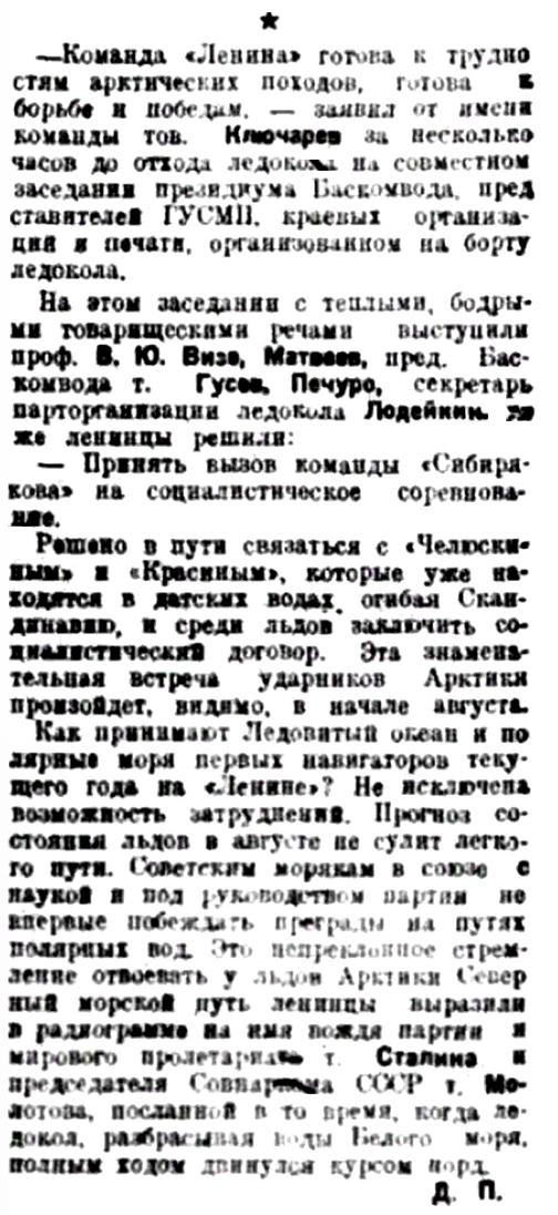 — Команда "Ленина" готова к трудностям арктических походов, готова к борьбе и победам, — заявил от имени команды тов. Ключарев за несколько часов до отхода ледокола на совместном заседании президиума Баскомвода, представителей ГУСМП, краевых организаций и печати, организованном на борту ледокола.