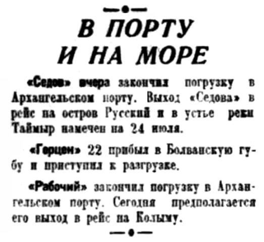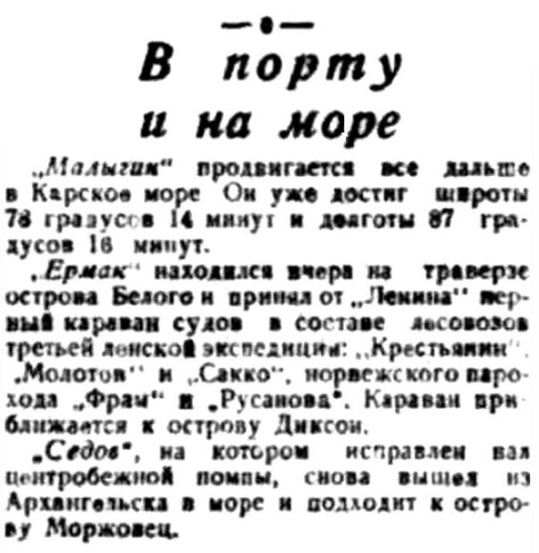 БОРТ "СЕДОВА", 4 (по радио от наш. спец. корр.). Сегодня в 12 часов дня ледокол "Седов" после бункеровки у Диксона вышел на остров Русский. Ледокол выполняет задание по постройке новой радиостанции на острове и одновременно используется для проводки судов Ленско-Карской экспедиции. "Седов" ведет суда до встречи их с ледоколом "Ермак", который вышел с Диксона 2 августа на разведку льда до пролива Вилькицкого.