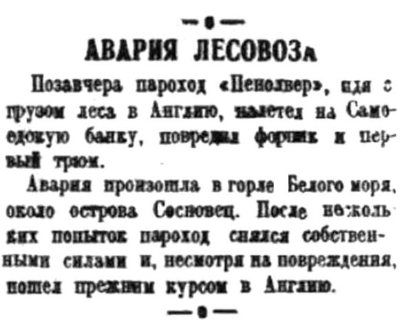 Позавчера пароход "Пенолвер", идя с грузом леса в Англию, налетел на Самоедскую банку, повредил форпик и первый трюм.