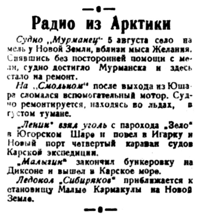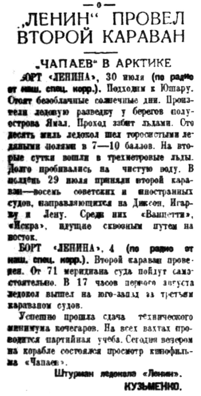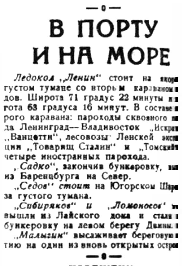 БОРТ "ЛЕНИНА" (по радио от наш. спец. корр). 25 июля через Юшар ледокол "Ленин" вышел сквозь льды с первым караваном судов, идущих к устьям Оби и Енисея. В составе нашего каравана идет "Русанов", который впервые идет в далекий порт Индигирку.