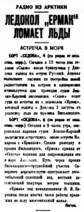 БОРТ "СЕДОВА", 6 (по радио от наш. спец. корр.) Сегодня в 9 часов утра, сопровождая караван судов Ленско-Карской экспедиции, встретились около острова Макарова с "Ермаком". Сделав разведку в пролив Вилькицкого, "Ермак" принял от "Седова" караван для сопровождения его в море Лаптевых. Путь через пролив Вилькицкого — труднейший участок Северного морского пути — преграждает десятибалльный сплошной лед, местами достигающий полутора метров толщины.