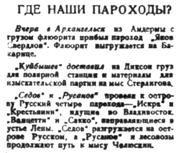 "Седов" и "Русанов" провели к острову Русский четыре парохода — "Искра" и "Крестьянин", идущие во Владивосток. "Ванцетти" и "Сакко", направляющиеся в устье Лены. "Седов" разгружается на острове Русском, а "Русанов" и лесовозы продолжают путь к мысу Челюскин.