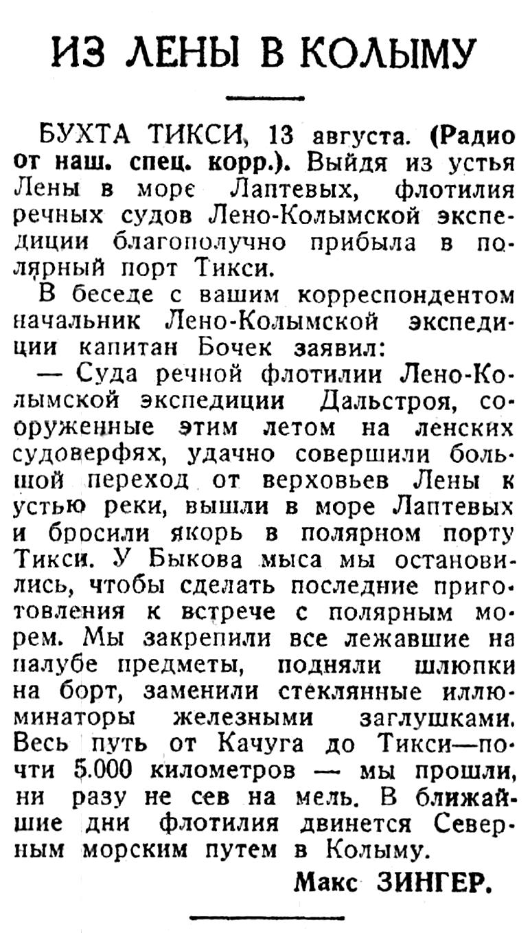 — Суда речной флотилии Лено-Колымской экспедиции Дальстроя, сооруженные этим летом на ленских судоверфях, удачно совершили большой переход от верховьев Лены к устью реки, вышли в море Лаптевых и бросили якорь в полярном порту Тикси. У Быкова мыса мы остановились, чтобы сделать последние приготовления к встрече с полярным морем. Мы закрепили все лежавшие на палубе предметы, подняли шлюпки на борт, заменили стеклянные иллюминаторы железными заглушками. Весь путь от Качуга до Тикси — почти 5.000 километров — мы прошли, ни разу не сев на мель. В ближайшие дни флотилия двинется Северным морским путем в Колыму.