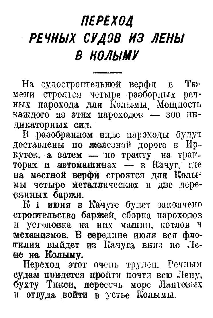 В разобранном виде пароходы будут доставлены по железной дороге в Иркутск. а затем — по тракту на тракторах и автомашинах — в Качуг, где на местной верфи строятся для Колымы четыре металлических и две деревянных баржи.