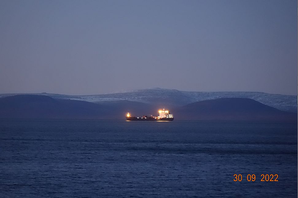 К нам заходил буровик "Бавенит", залился и пошёл на восток. Ночью он выглядит как джонка с ёлкой :)