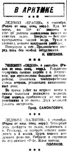 И наконец 20 сентября краснознаменный ледорез, выполнив целиком свое задание и пройдя в одну навигацию с востока на запад весь Северный морской путь, пришвартовался в Мурманске.